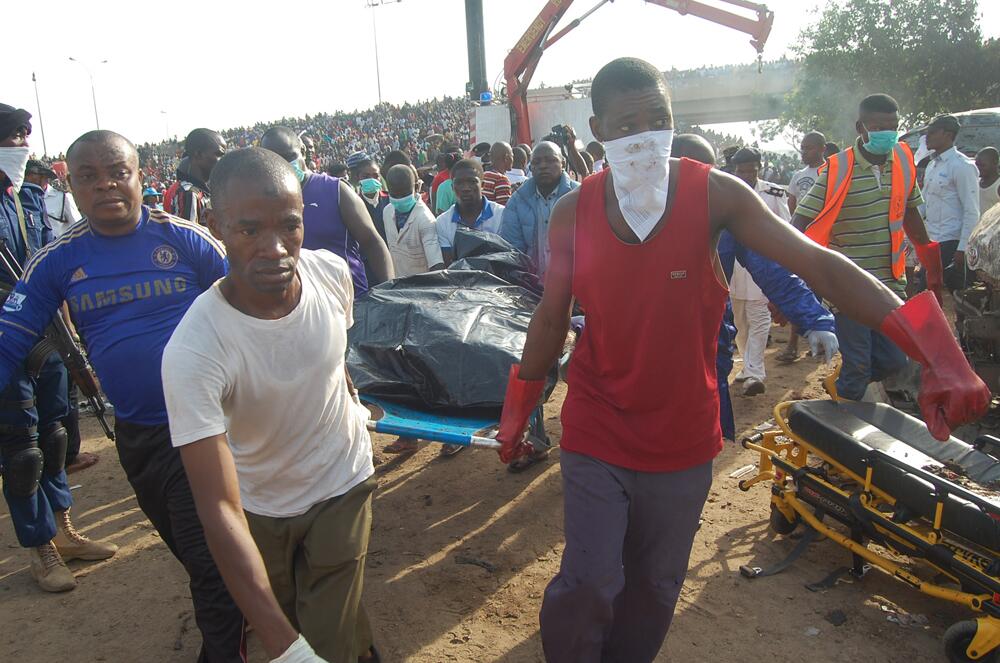 Security personnel battled to belatedly cordon off the area as a bomb detonation team was combing it for secondary explosives, a common occurrence here. Thousands of bystanders gathered, ignoring warnings to stay away. While violence has torn the northeast where Boko Haram has killed thousands, the capital in the middle of Africa's most populous country has been relatively peaceful.